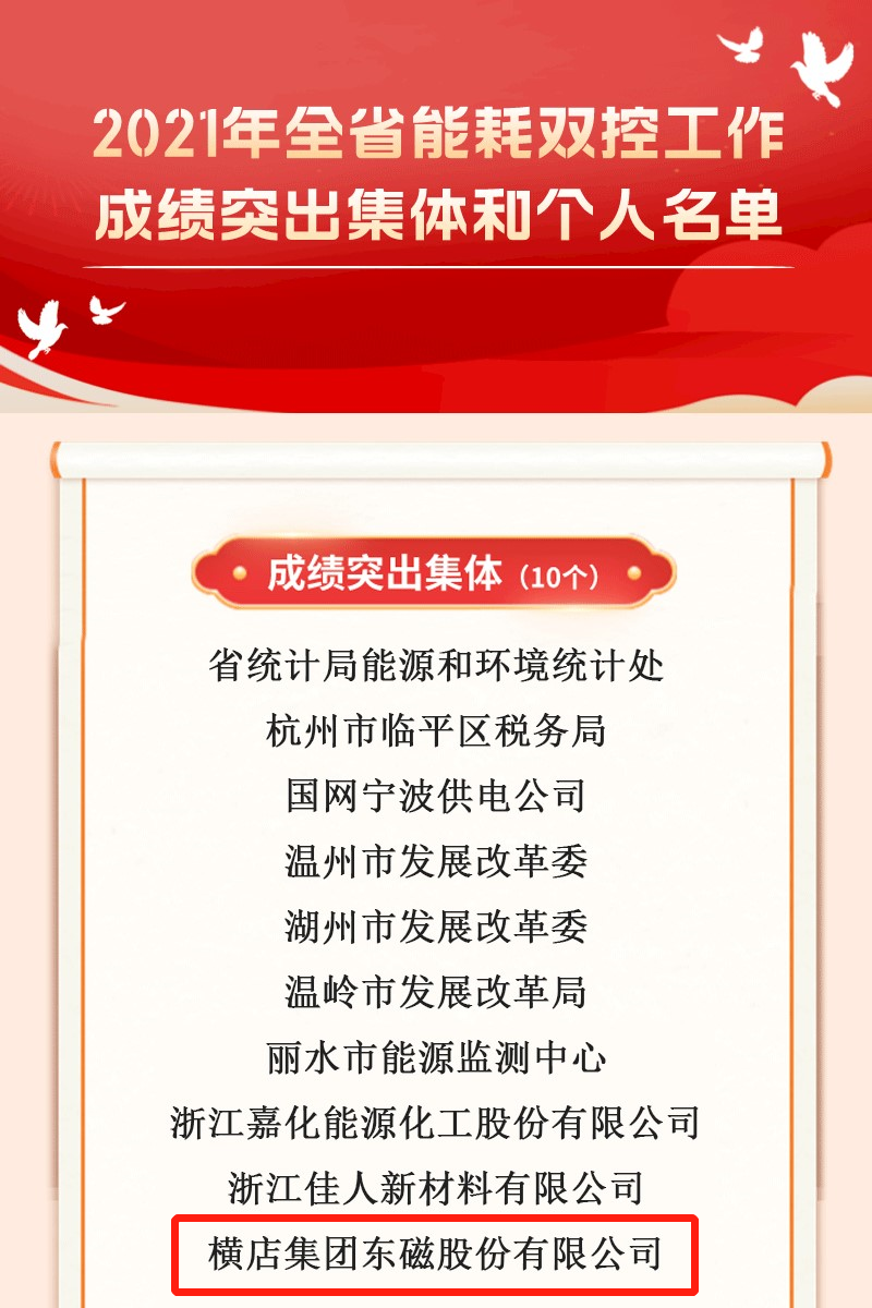 11月25日,2022年浙江省节能新技术新产品新装备展览会在杭州开幕。启动仪式上,省发展改革委党组成员、省能源局局长周卫兵向《浙江省人民政府办公厅关于表扬2021年全省能耗双控工作成绩突出集体和个人的通报》中的10家获奖集体颁发奖杯和证书,横店东磁是其中之一,也是金华市唯一获此荣誉的企业。