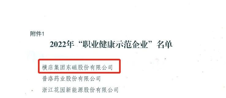 近日,2022年东阳市“职业健康示范企业”和“职业健康达人”评选结果公布,横店东磁榜上有名,获“职业健康示范企业”称号。