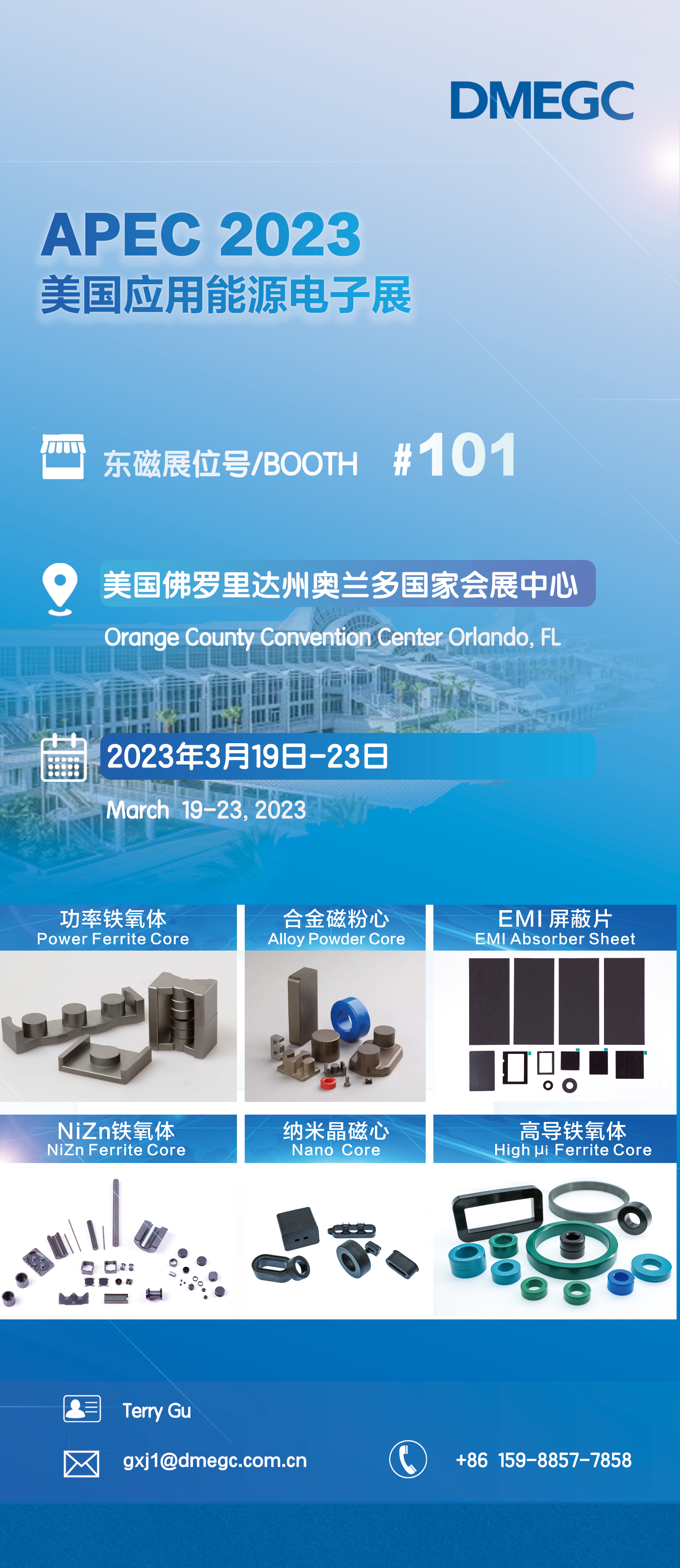 3月19日至23日,2023 APEC(美国应用能源电子展)将于佛罗里达州奥兰多国家会展中心举行。届时,横店东磁将携多款软磁材料新产品亮相101号展位,欢迎莅临参观交流!