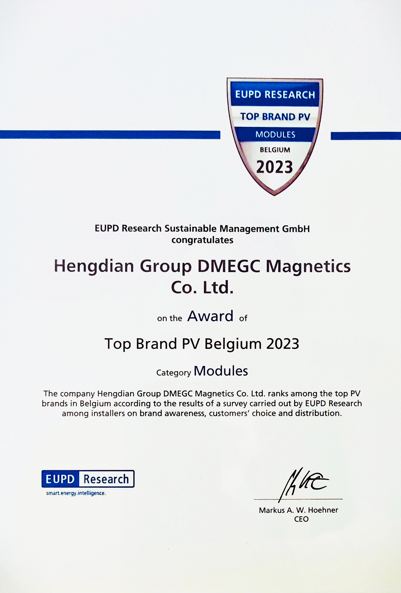 同时,全球权威的独立市场研究机构EUPD Research向横店东磁颁发“2023顶级光伏品牌”证书。这也是公司自2018年起连续6年获此荣誉,再次体现了公司在欧洲市场领先的产品口碑和客户认可度。