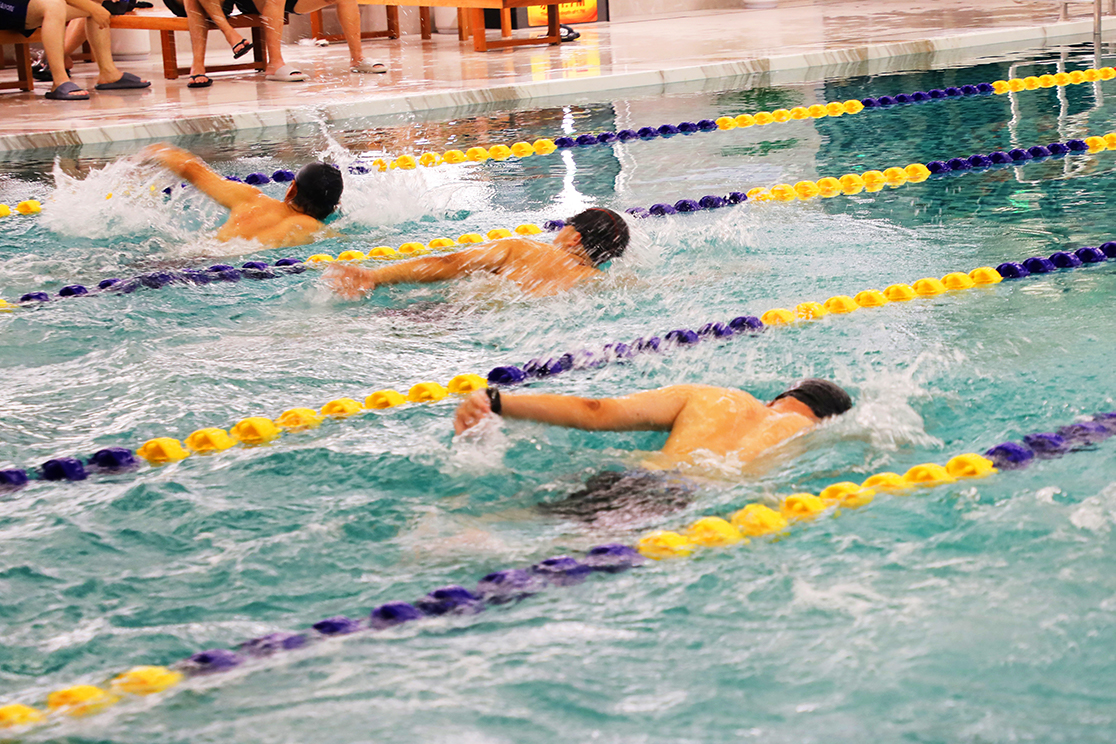 下午两点,游泳馆内人声鼎沸,运动健儿们早已换上泳装,蓄势待发。只听得一声令响,游泳健将们迅速反应,矫健的身姿,如利箭出弦,你追我赶间,浪花翻涌。一场激烈的游泳比赛,瞬间火热上演。
