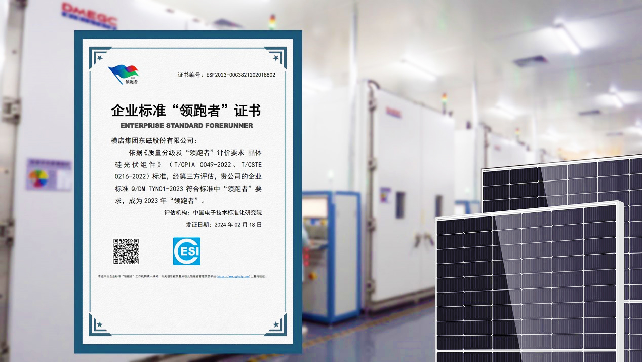 近日,横店东磁凭借在光伏行业制定的高水平标准,喜获由中国电子技术标准化研究院颁发的2023年度企业标准“领跑者”证书,成为业内首批十家“领跑者”之一。
