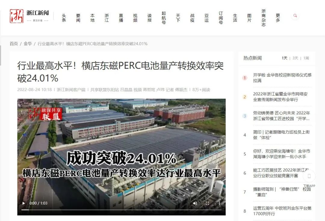 浙江新闻客户端、《金华日报》等媒体关注并点赞横店东磁太阳能光伏产业技术创新工作和取得的重大成果。