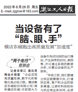 8月26日,浙江工人日报刊发《当设备有了“脑、眼、手”》,点赞横店东磁加快推进数字化、智能化,实现高质量发展的经验做法。